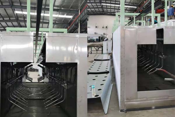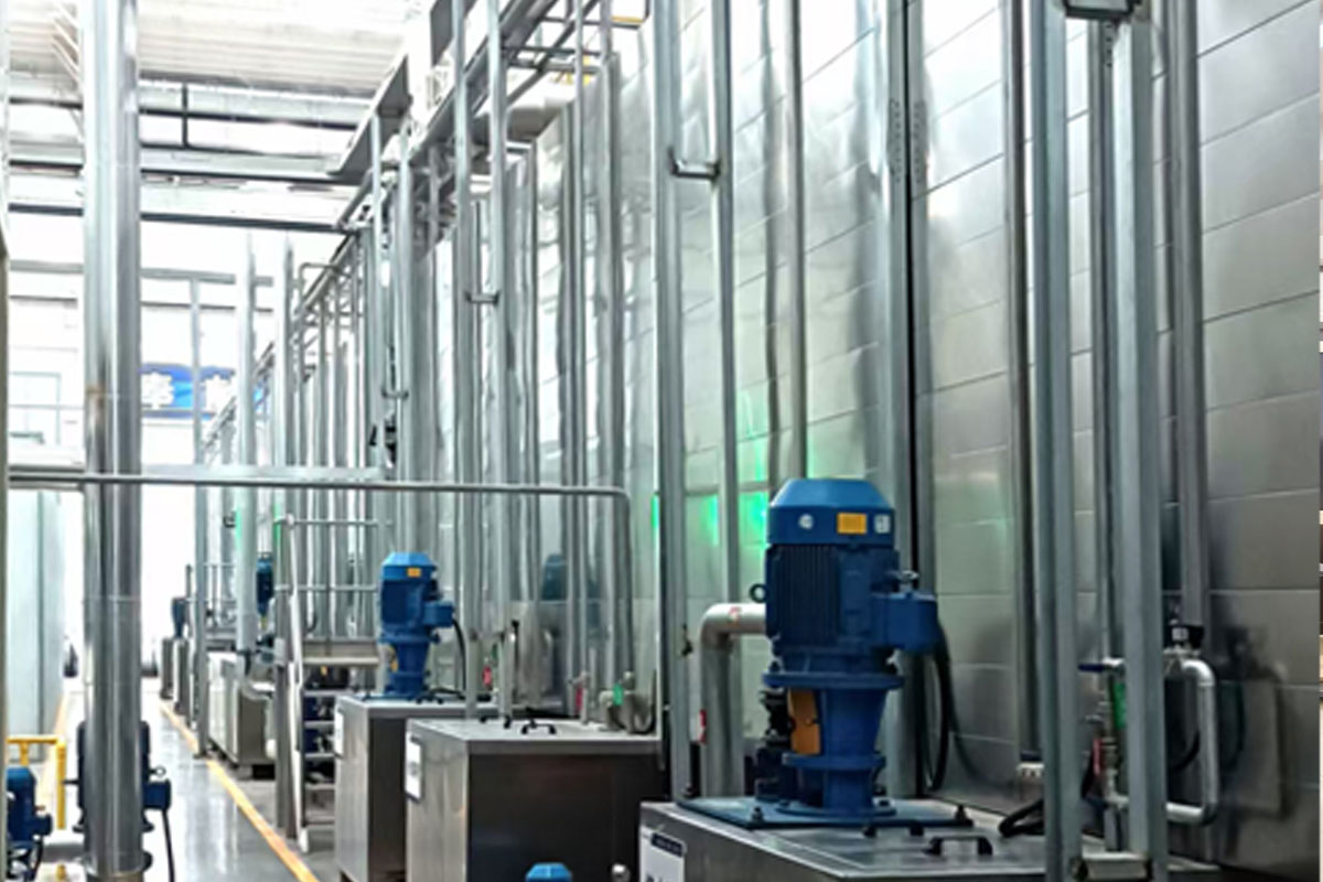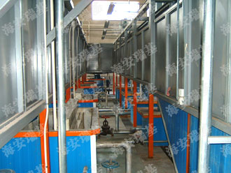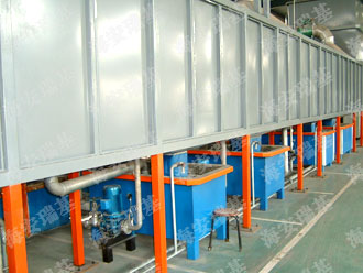 前處理生產(chǎn)線(xiàn)結(jié)構(gòu)特點(diǎn)是:前處理生產(chǎn)線(xiàn)各工序噴淋管布置在隧道內(nèi),噴淋由各液槽的泵來(lái)提供.各工序間都有門(mén)洞板隔開(kāi),以防竄液.各加熱液槽的加熱形式有槽內(nèi)和槽外。內(nèi)加熱器有排管、蛇形管、波紋板等;外加熱器有列管、板式加熱器等。加熱介質(zhì)有熱水 、蒸汽、導(dǎo)熱油等。在脫脂、磷化工序分別設(shè)有除油系統(tǒng)和除渣系統(tǒng)。為防止各加熱段隧道頂部及門(mén)洞處溢出蒸汽,在隧道頂部設(shè)有排風(fēng)機(jī)。